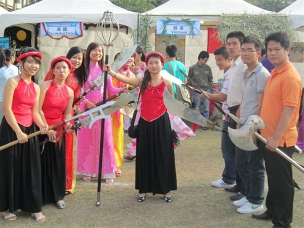 Hình ảnh sinh viên Việt Nam vui đùa với các binh khí trưng bày của của các bạn sinh viên Đài Loan tại lễ hội văn hóa quốc tế của sinh viên các nước tại trường Nam Đài