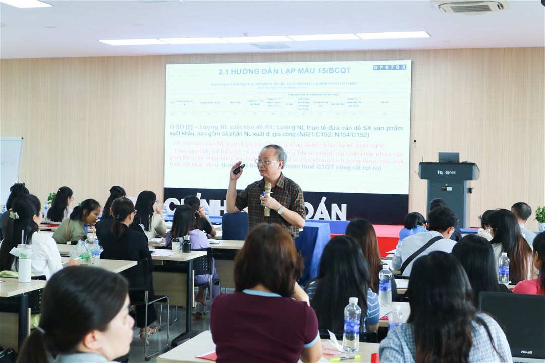 During the presentation, the speaker analyzed new regulations on the finalization of imported materials, and guided students on how to apply legal documents in real business contexts. Participants learned about document processing, data verification, preparation of financial reports, and the application of technology in import–export accounting management.