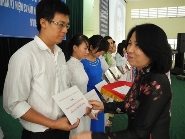 People's Teacher Dr. Do Huu Tai on behalf of Mrs Le Thi Tru awards scholarships to the receivers.