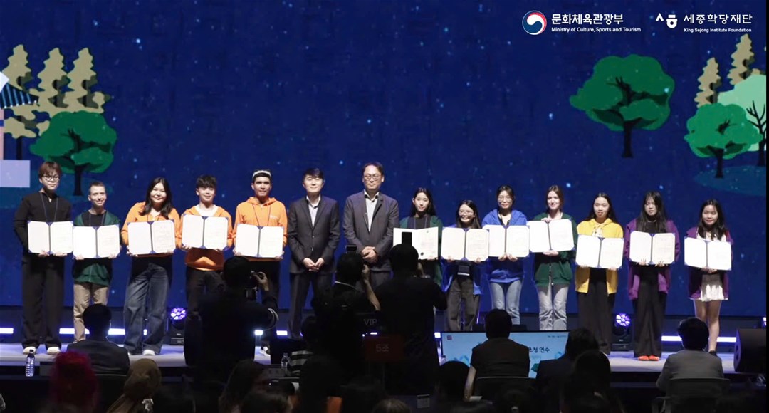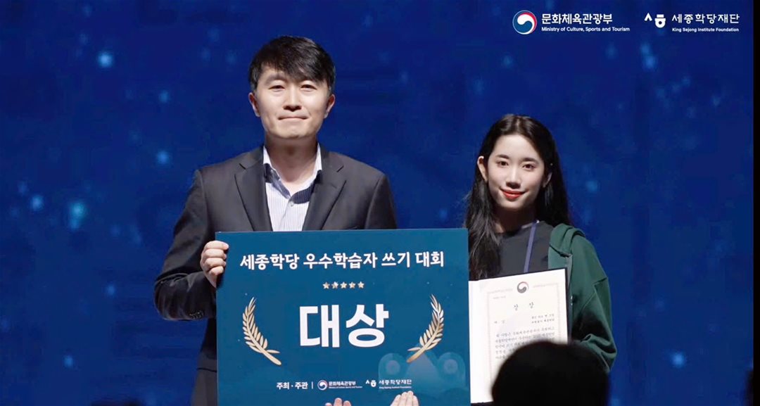 Duong Huynh Bao Tran receiving First prize at the 2025 King Sejong World Korean Writing Contest