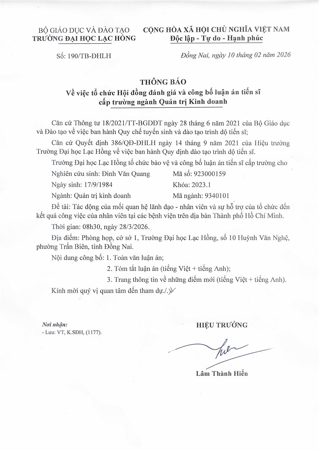 Thông báo lịch bảo vệ luận án tiến sĩ cấp Trường ngành Quản trị kinh doanh tháng 03 năm 2026