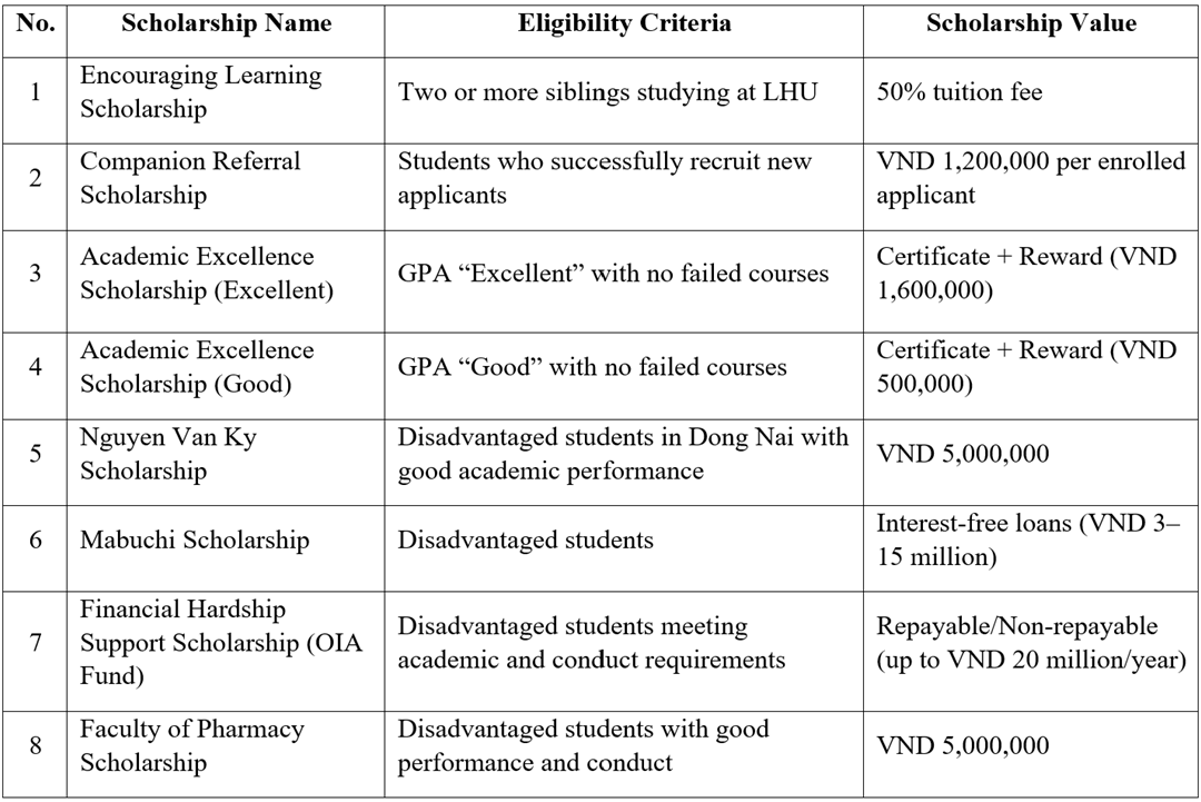In addition to attractive entrance scholarships, Lac Hong University (LHU) and the Faculty of Pharmacy (FOP) are committed to providing a comprehensive scholarship system to encourage academic excellence, recognize student achievements, and offer timely financial support throughout the study journey.
